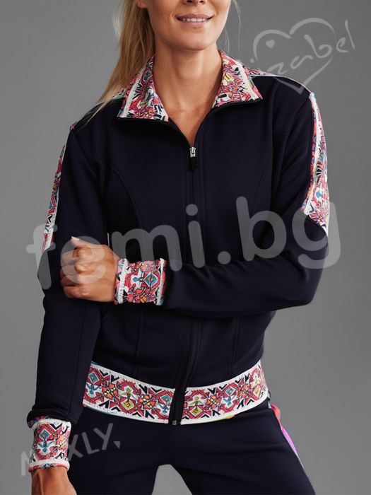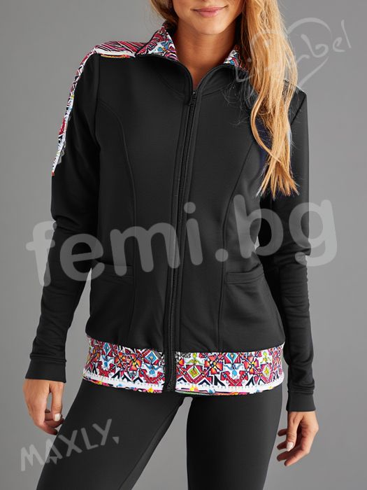 Дамско горнище подходящо за гимнастика, джогинг и фитнес. Изработено от еластична материя осигуряваща комфорт на тялото при натоварване. С народен мотив шевица на ръкавите и яката. Два джоба в предната част за вашият телефон.